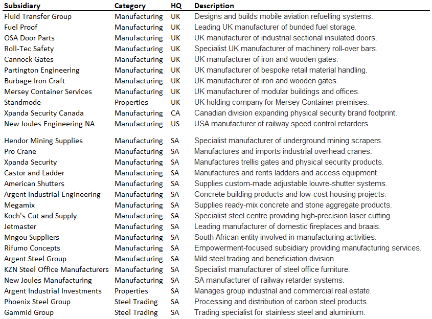 The subsidiaries in SA are a mix of legacy assets that they are still trying to get rid of, as well as some profitable manufacturing companies that are less likely to be sold.