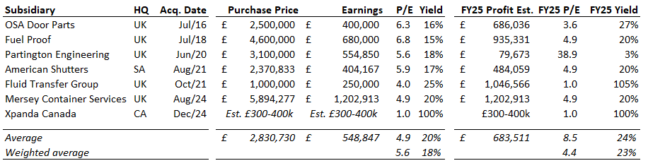 Important caveat: Argent does not provide a lot of subsidiary-level financials beyond the acquisition press releases, especially so for its UK holdings. One can glean a lot from annual filings made to the UK government’s Companies House website, but actual FY25 earnings might differ significantly in some cases. In addition, the purchase price has not been adjusted for any growth capex, so actual FY25 multiples might be a little higher than shown here.